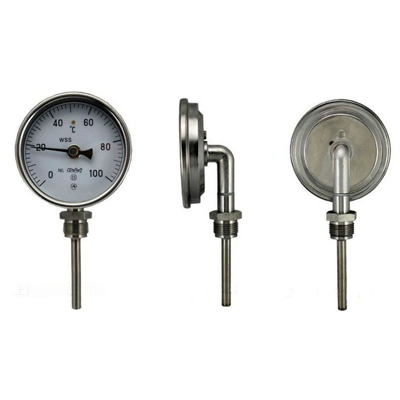 双金属温度计是一种测量中低温度的现场检测仪表。可以直接测量各种生产过程中的-80℃-+500℃范围内液体蒸汽和气体介质温度. 与玻璃水银温度计相比具有无汞害、易读数、牢固耐用等优点。
